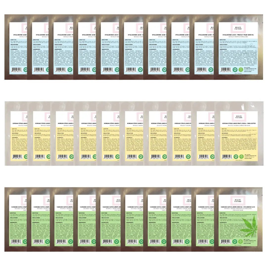 Beauty Factory Natural Mask Sets (30 PCS) Beauty Factory Hyaluronic Acid + Prickly Pear Seed Oil Sheet MaskBeauty Factory Hyaluronic Acid + Prickly Pear Seed Oil Sheet Mask refines skin’s texture, boosts radiance improves clarity. It reduces the appearance of fine lines and wrinkles. With this intensive anti-aging inflammatory sheet mask it gives the ability to reduce the appearance of fine lines, aging spots and general skin tiredness. The unique blend of Hyaluronic Acid and Prickly Pear Seed Oil containing multi-vitamins, help to reduce fine lines and the signs of aging.