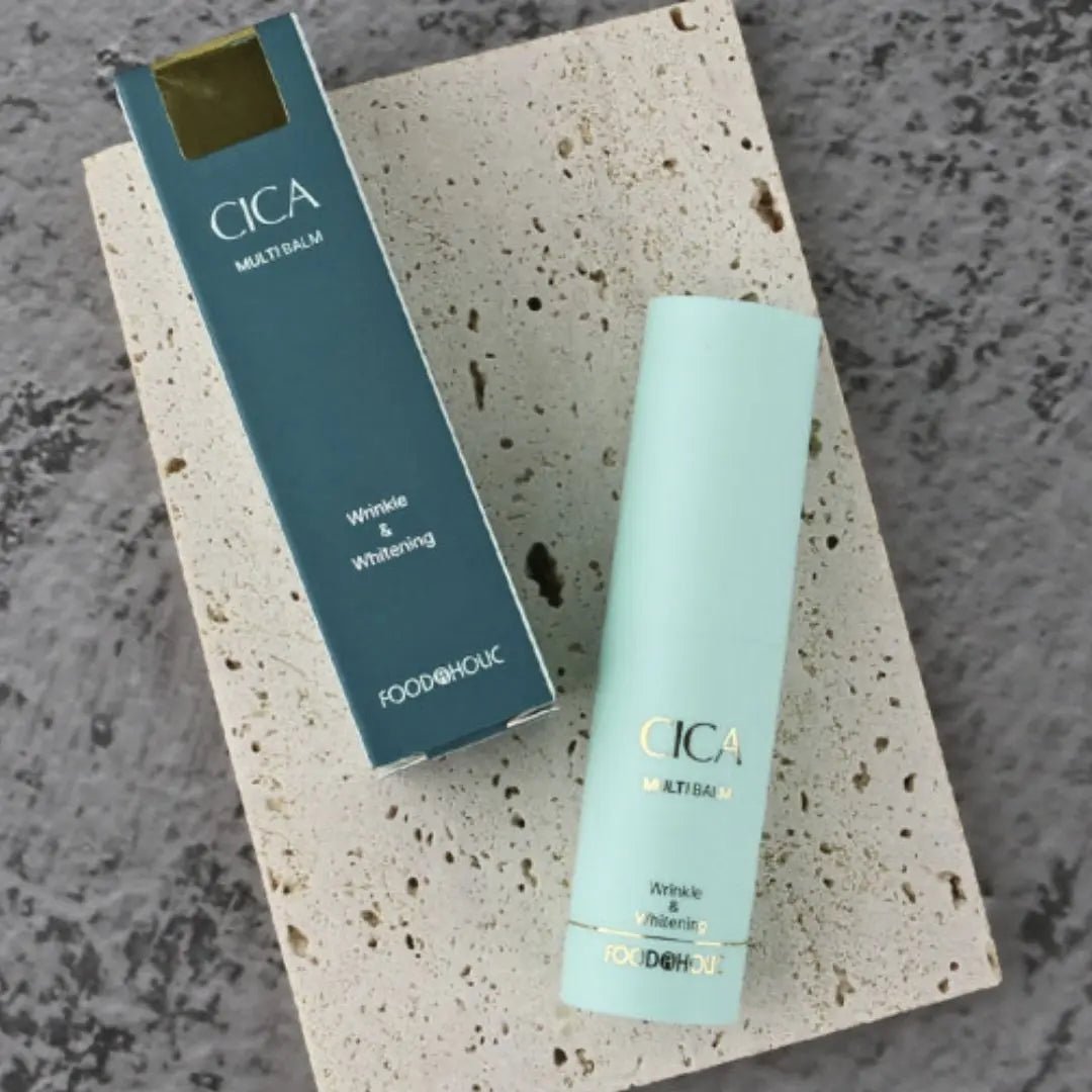 Foodaholic Cica Multi Balm is formulated with Centella asiatica extract (Cica) and Madecassic acid to soothe irritated skin and improve wrinkles and whitening. It contains 8 types of plant ingredients, including greenol (herb extract) to provide natural and gentle care. The light mint-colored, unscented balm targets wrinkles around the eyes, neck, nasolabial folds, and dead skin cells, revitalizing dull and stressed skin. With just one stick, it deeply nourishes inelastic and saggy skin, giving it a youthful and radiant appearance.