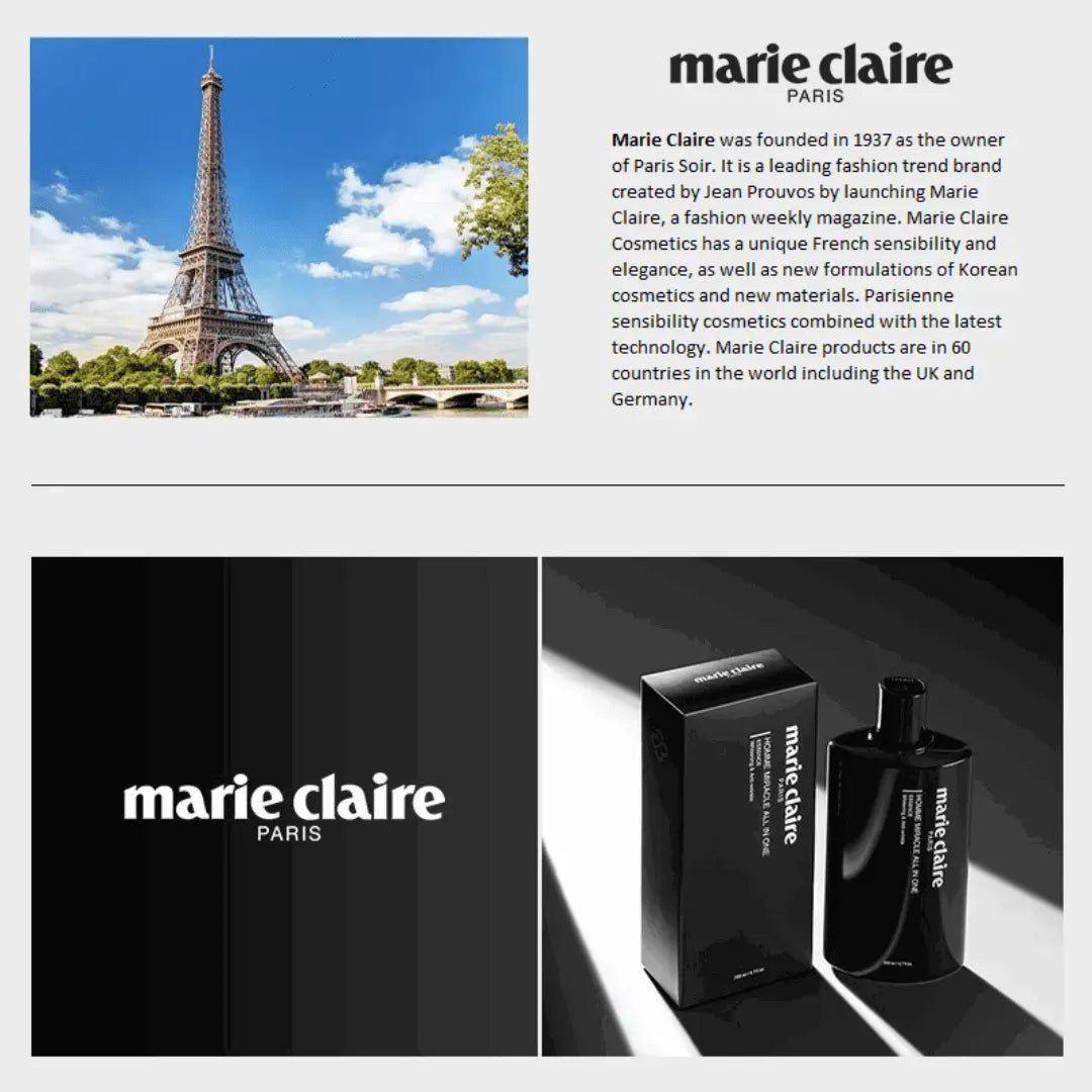 Marie Claire Homme Miracle All in One Essence for men provides a powerful anti-wrinkle and whitening solution. It deeply penetrates the skin, delivering moisture for improved elasticity and firmness for a younger-looking complexion. Its floral musk woody scent leaves skin feeling fresh and subtle.