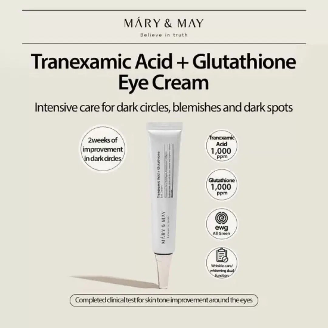 Mary&May Tranexamic Acid+ Glutathion Eye Cream contains a blend of 1,000ppm Tranexamic Acid and Glutathione, scientifically proven to reduce under-eye dark circles and freckles for a brighter, more refined eye area. Its powerful antioxidant properties and ability to inhibit melanin synthesis rejuvenate tired eyes and give a radiant, illuminated look. This cruelty-free eye cream also includes vitamin C to improve freckles and promote collagen formation. It is formulated with EWG verified green grade ingredients and has been dermatologically tested for safety and effectiveness.