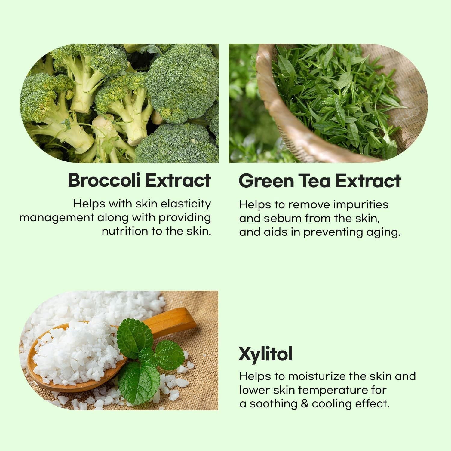 - Camellia Sinensis Leaf Extract, Broccoli Extract, and Madecassic Acid help strengthen the skin's moisture barrier and keeps the skin hydrated all day long