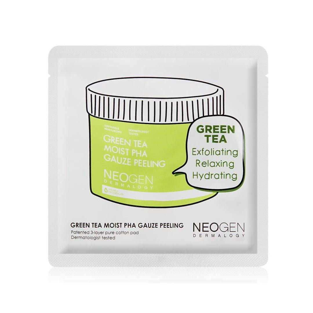 NEOGEN Green Tea Moist PHA Gauze Peeling Pad effectively exfoliates and purifies the skin, while providing nourishment. This Peeling line offers three separate pads (Green tea, Lemon, and Wine) specifically tailored to address different concerns. The patented 3-layer pure cotton pad in the Gauze Peeling Pads is designed to gently remove dead skin cells, revealing customized effects for each skin condition. The Green Tea Moist PHA Gauze Peeling is a unique product with a patented triple structured pure cotton pad. On one side, the soft gauze cotton gently exfoliates dead skin cells and removes impurities, while the other side is infused with moisturizing essence to nourish and soothe stressed skin.