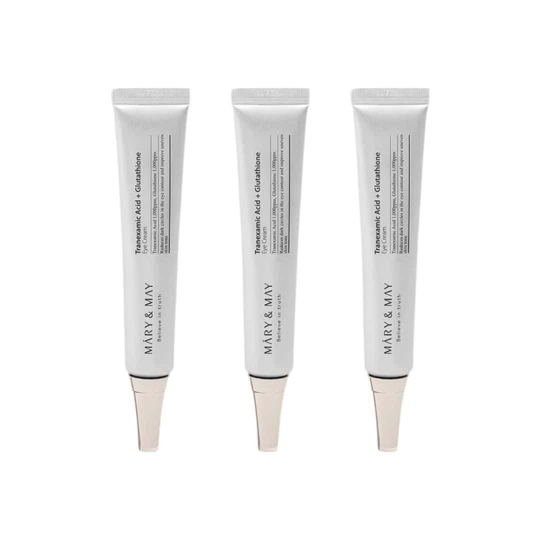 Mary&May Tranexamic Acid+ Glutathion Eye Cream contains a blend of 1,000ppm Tranexamic Acid and Glutathione, scientifically proven to reduce under-eye dark circles and freckles for a brighter, more refined eye area. Its powerful antioxidant properties and ability to inhibit melanin synthesis rejuvenate tired eyes and give a radiant, illuminated look. This cruelty-free eye cream also includes vitamin C to improve freckles and promote collagen formation. It is formulated with EWG verified green grade ingredients and has been dermatologically tested for safety and effectiveness.
