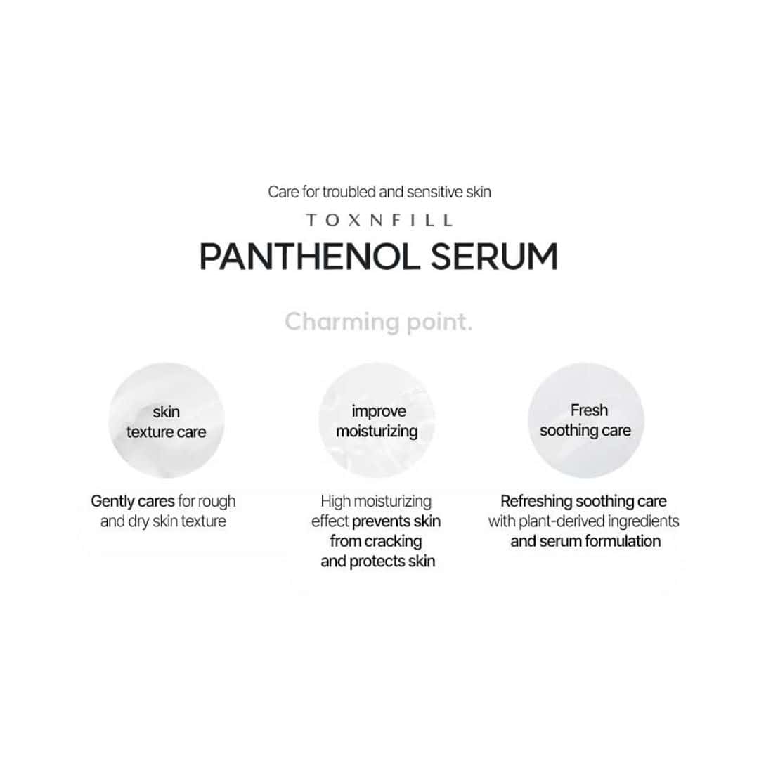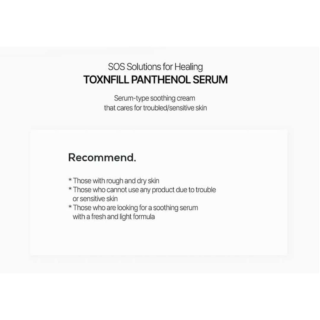 TOXNFILL Panthenol Serum is specifically designed for healing scarred and damaged skin. Made with plant-derived ingredients, this gentle serum has a refreshing and lightweight texture that is suitable for troubled and sensitive skin. Additionally, it is an ideal choice for those with complex skin concerns that are prone to oiliness and sensitivity, as well as those with rough and dry skin. This moisturizing serum absorbs quickly, leaving skin feeling hydrated and revitalized.