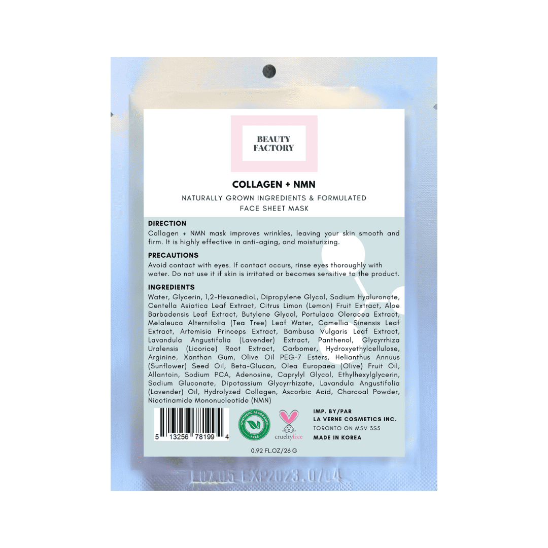 Beauty Factory Beauty Factory Collagen + NMN Mask refines skin’s texture, smooths dry skin, and reduces skin swelling. It helps fight breakouts and soothe skin problems. This mask is safe for all skin types and great for a sensitive skin.